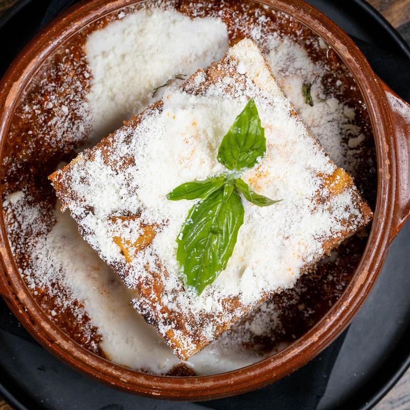 Classic Southern Italian style baked eggplant in a casserole, parmigiano reggiano, fresh mozzarella.