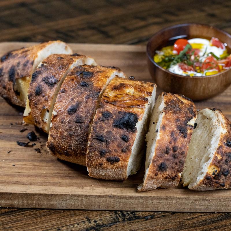 Homemade and baked to order, with a side of homemade stracciatella and Sicilian EVOO, grape tomatoes, basil.