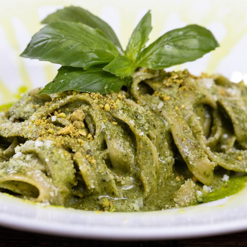 Homemade fettuccine, homemade pistachios, basil pesto, butter, Sicilian pistachios.