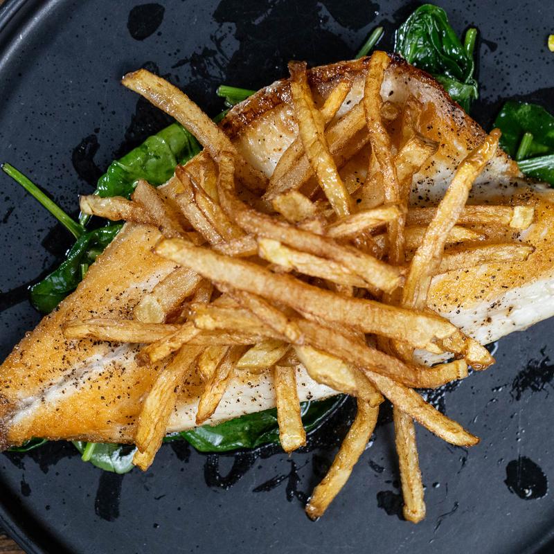 Mediterranean boneless sea bass filet, sauteed spinach, potato crust.