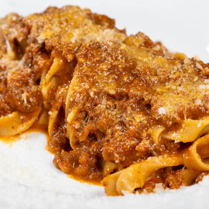 Homemade fettuccine, traditional Bolognese sauce, aged parmigiano reggiano.