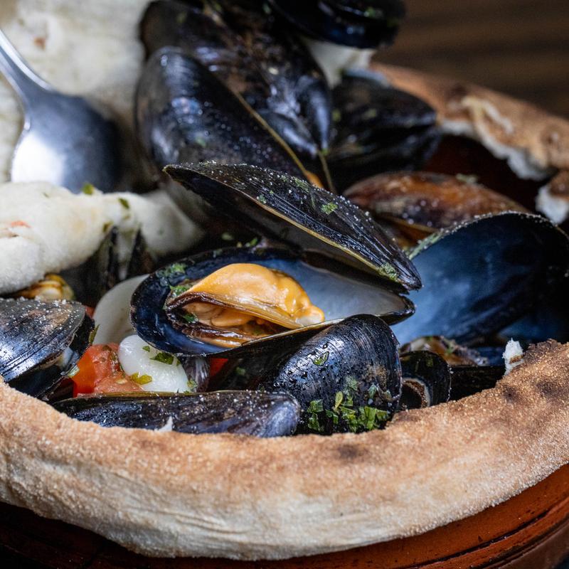 PEI black mussels, garlic, white wine, pizza crust top.