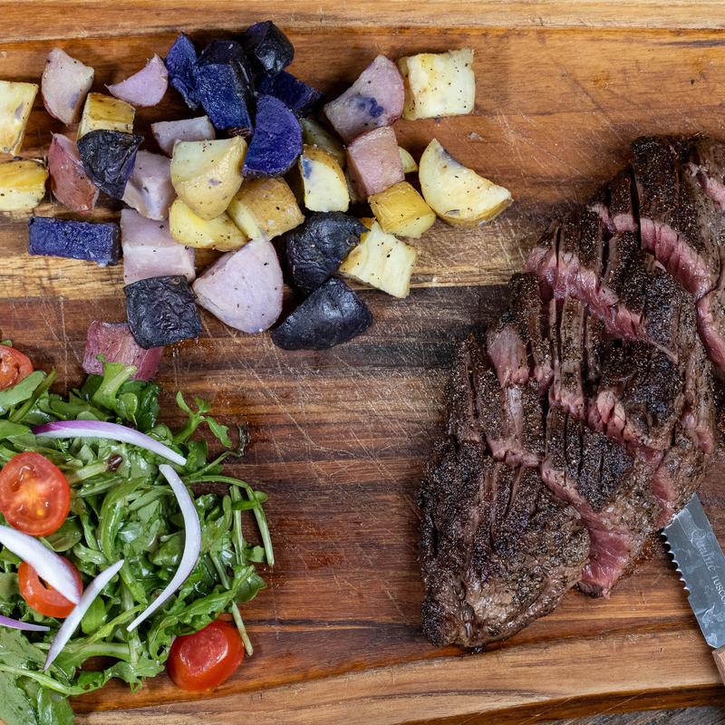 12 oz prime steak, rainbow potatoes, arugula salad.